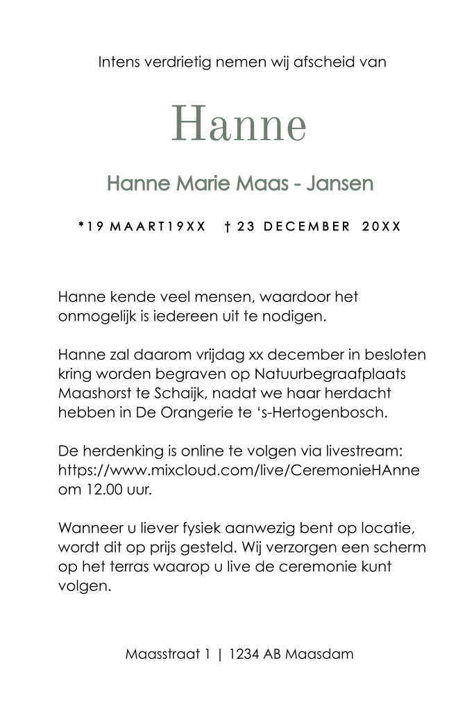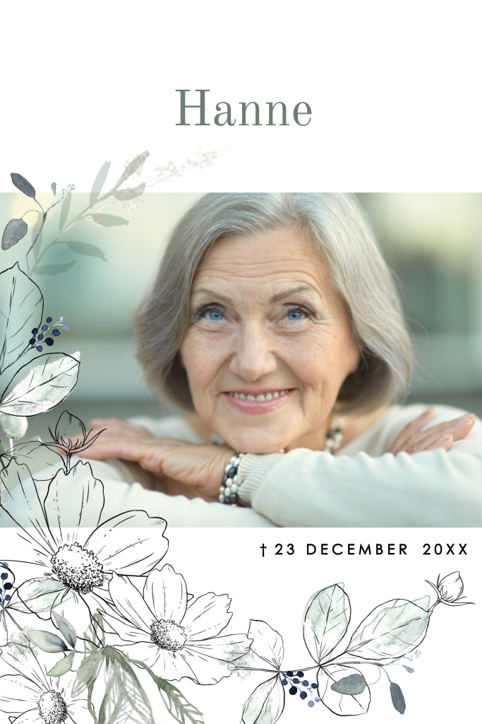 Rouwkaart vrouw met foto en bloemen in zachte tinten groen