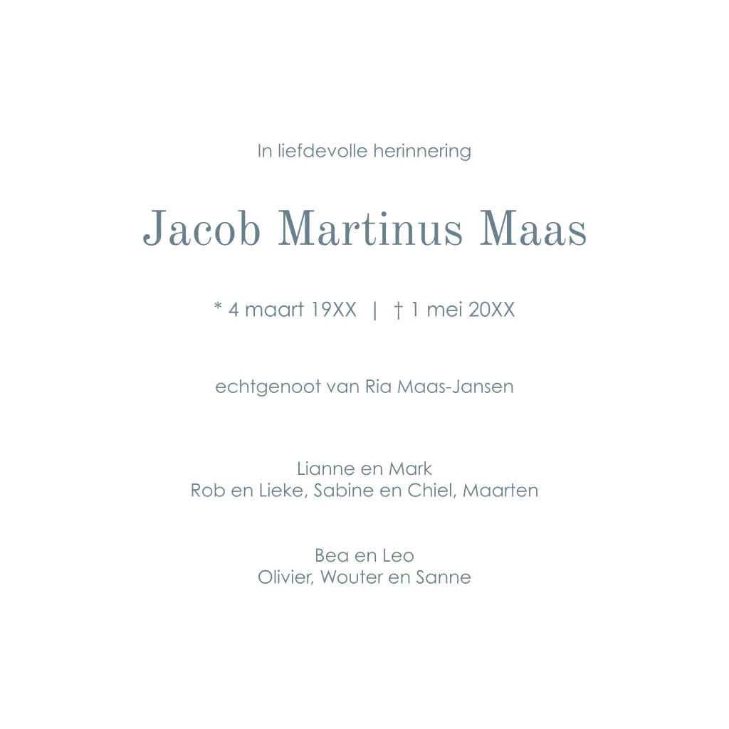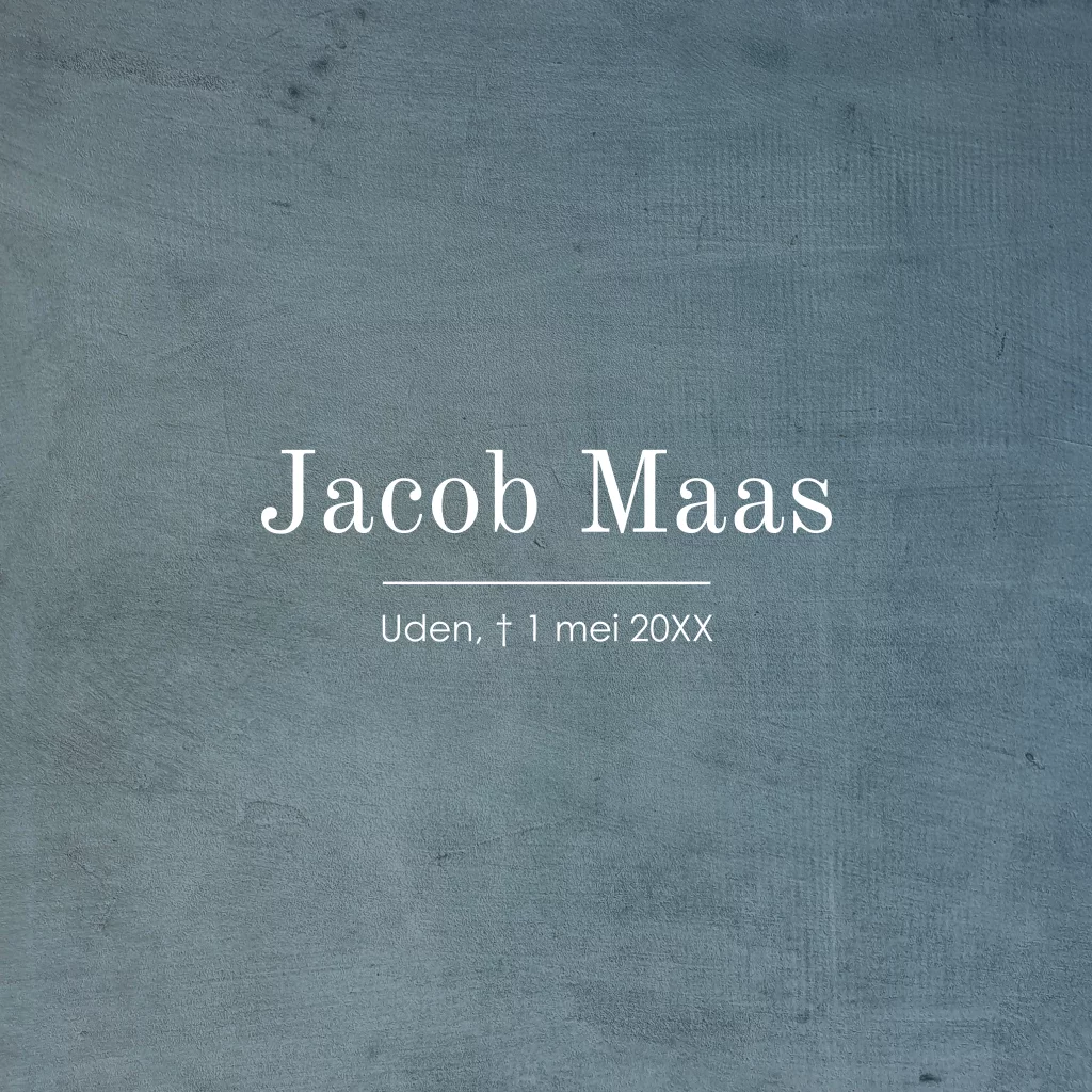 Moderne rouwkaart man in blauw met strakke typografie