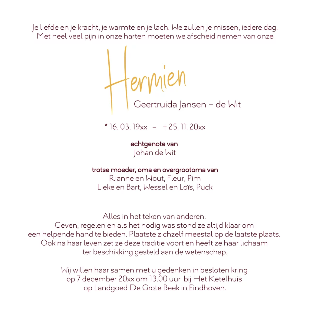 Een bijzondere rouwkaart met een liefdevolle foto en een oprecht gedicht: 'Weinig nemen en veel geven, altijd hartelijk en warm.' Deze kaart herinnert aan een dierbare die met warmte en vrijgevigheid in het leven stond.