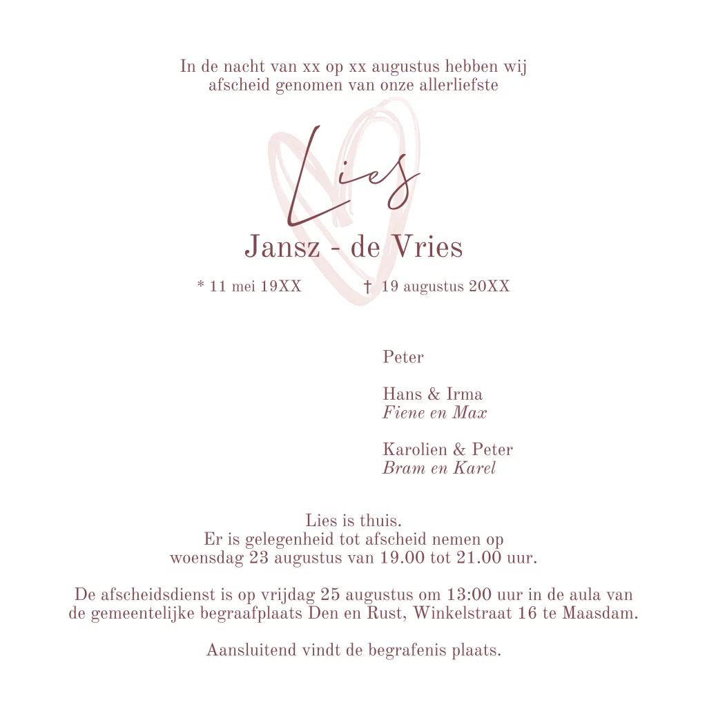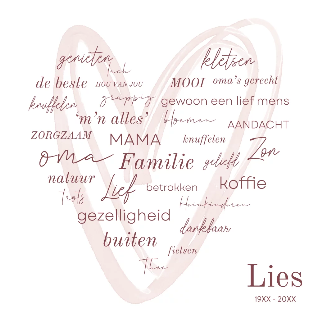 Met woorden die passen bij het karakter van uw dierbare maakt u in een hartvorm een persoonlijke rouwkaart.