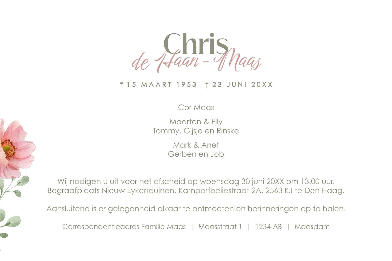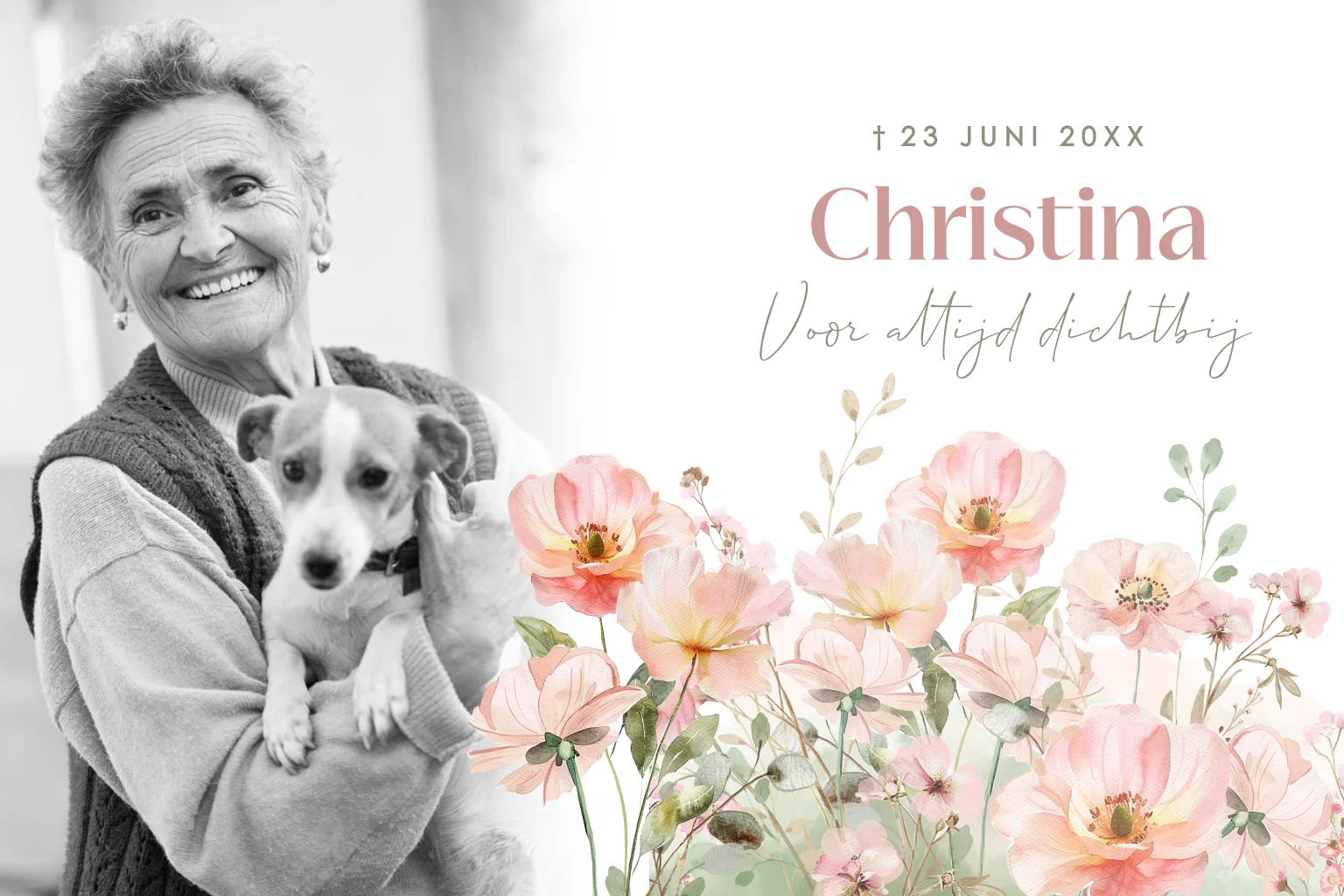 Rouwkaart met een mooie foto en zachte veldbloemen. Persoonlijk en liefdevol vormgegeven om een dierbare te herdenken.