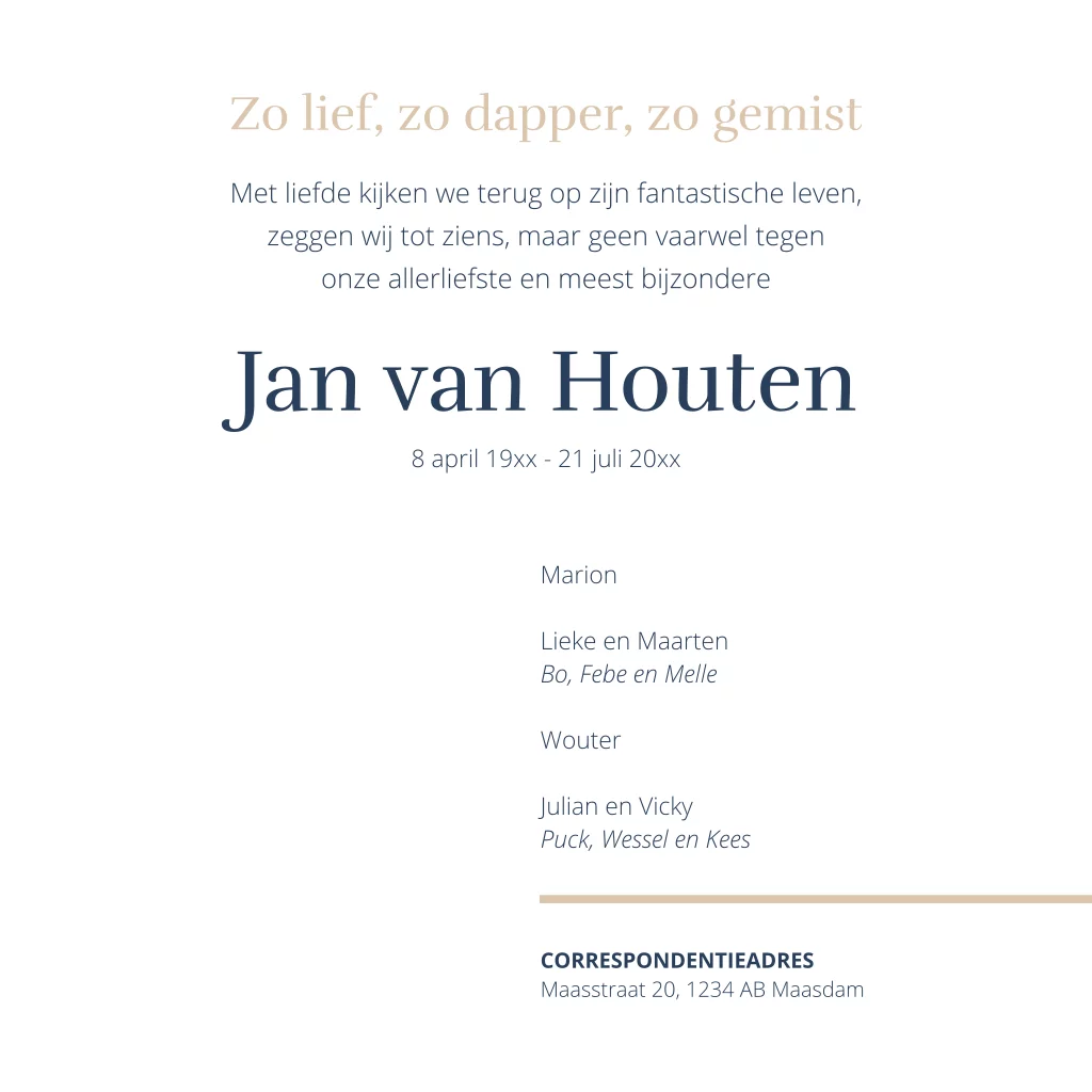 Rouwkaart met warme blauwtinten en ingetogen portret