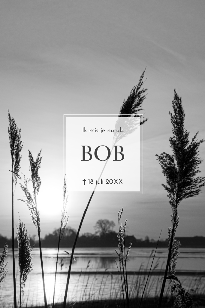 Rouwkaart met zwart-wit foto water en rietpluimen