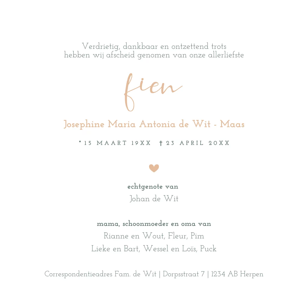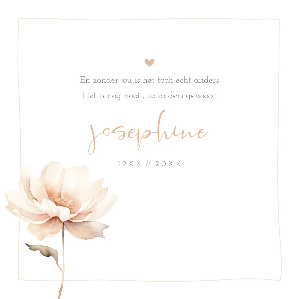 Rouwkaart met een warme bloemillustratie, zachte kleuren en sierlijke lettertypes — een liefdevol eerbetoon in een rustige en verfijnde stijl.