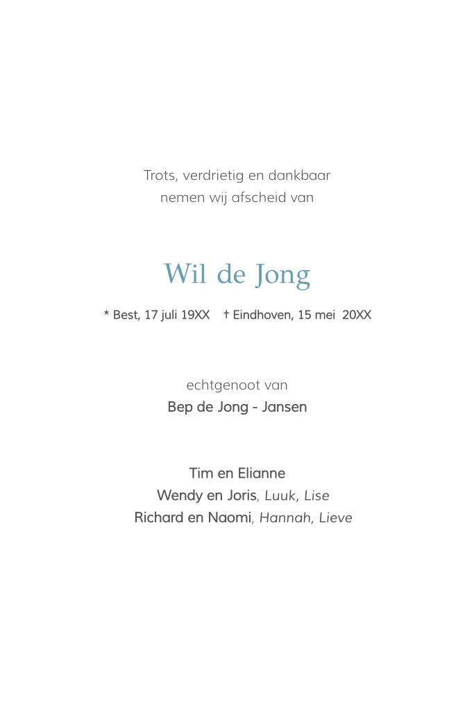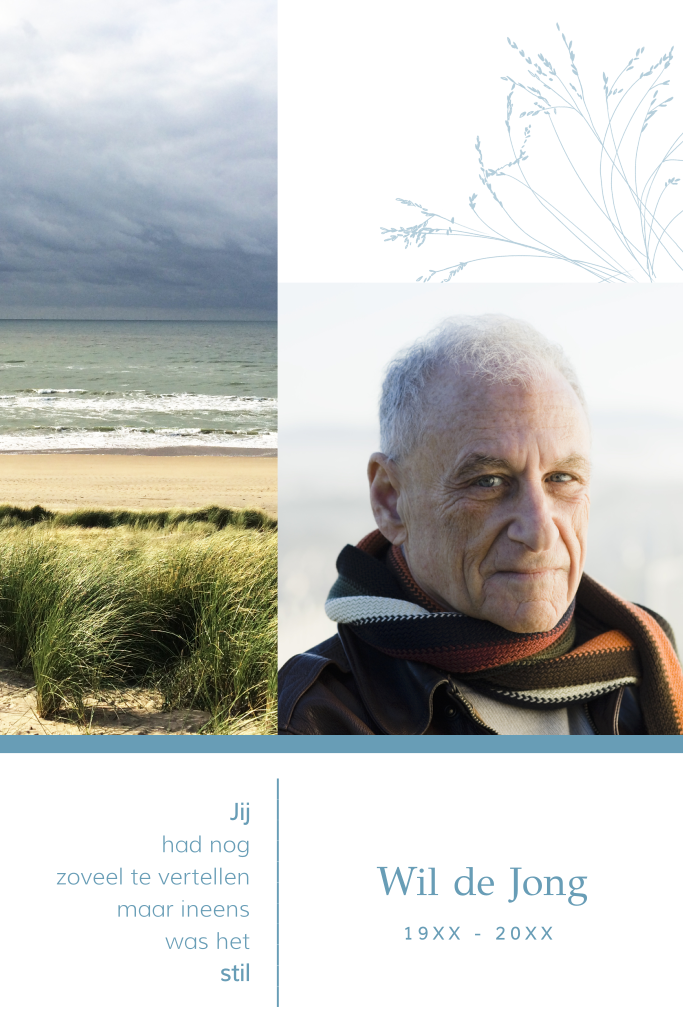 De collage op de rouwkaart is in het thema zee gecombineerd met een portret. Kies de favoriete foto's van uw dierbare en vervang deze in de editor.