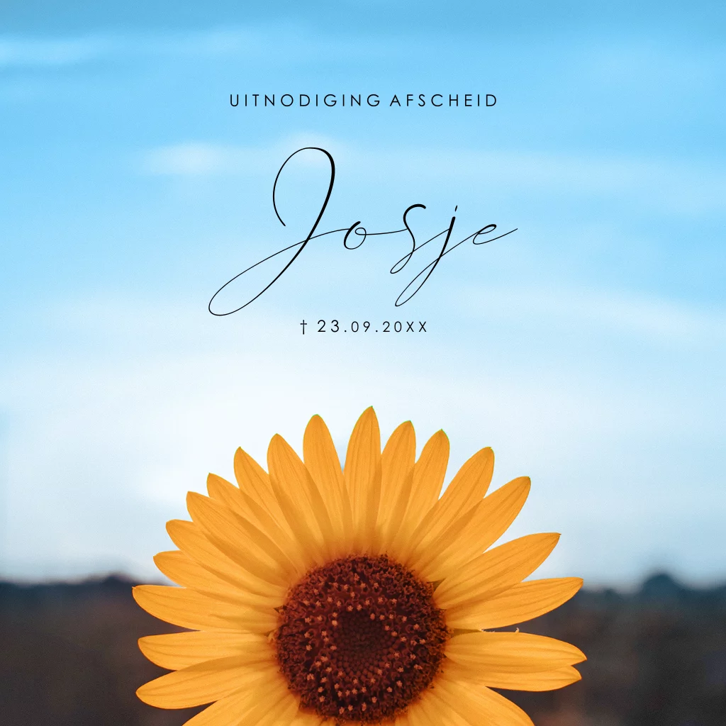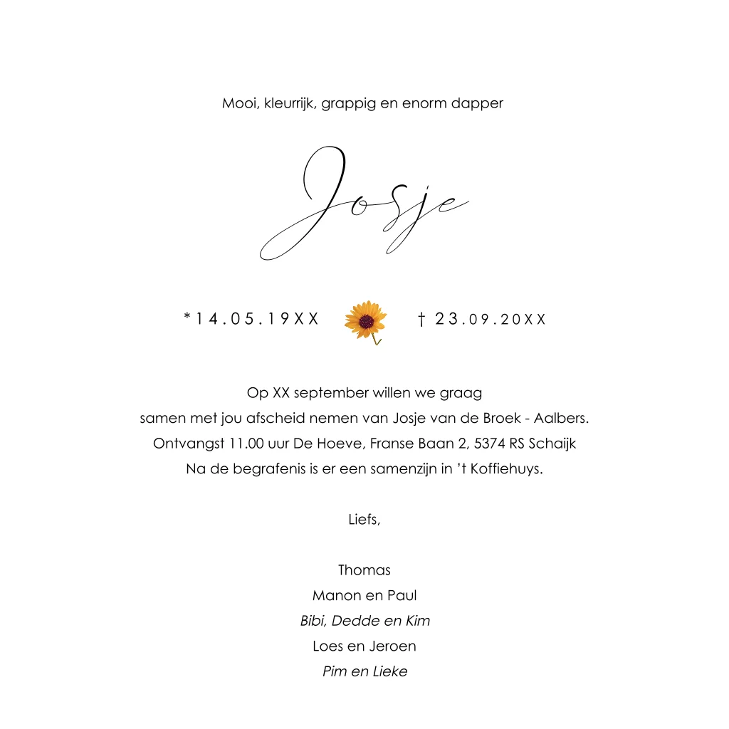 Een kleurrijke, krachtige rouwkaart met zonnebloem. Pak de kaart op en bewerk de teksten, keuze lettertype en de kleur in de editor.