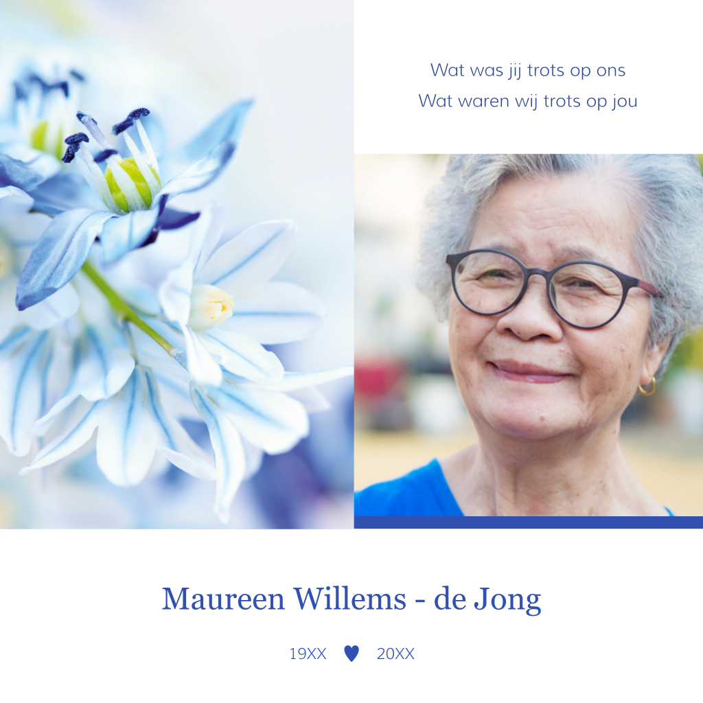 Een collage met een gefotografeerde lelie en een foto van de overledene. De blauwe kleuren geven de kaart een krachtige uitstraling.