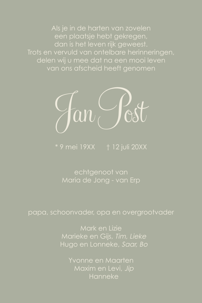 Maak samen met uw familie een rouwkaart die past bij het karakter van uw dierbare.