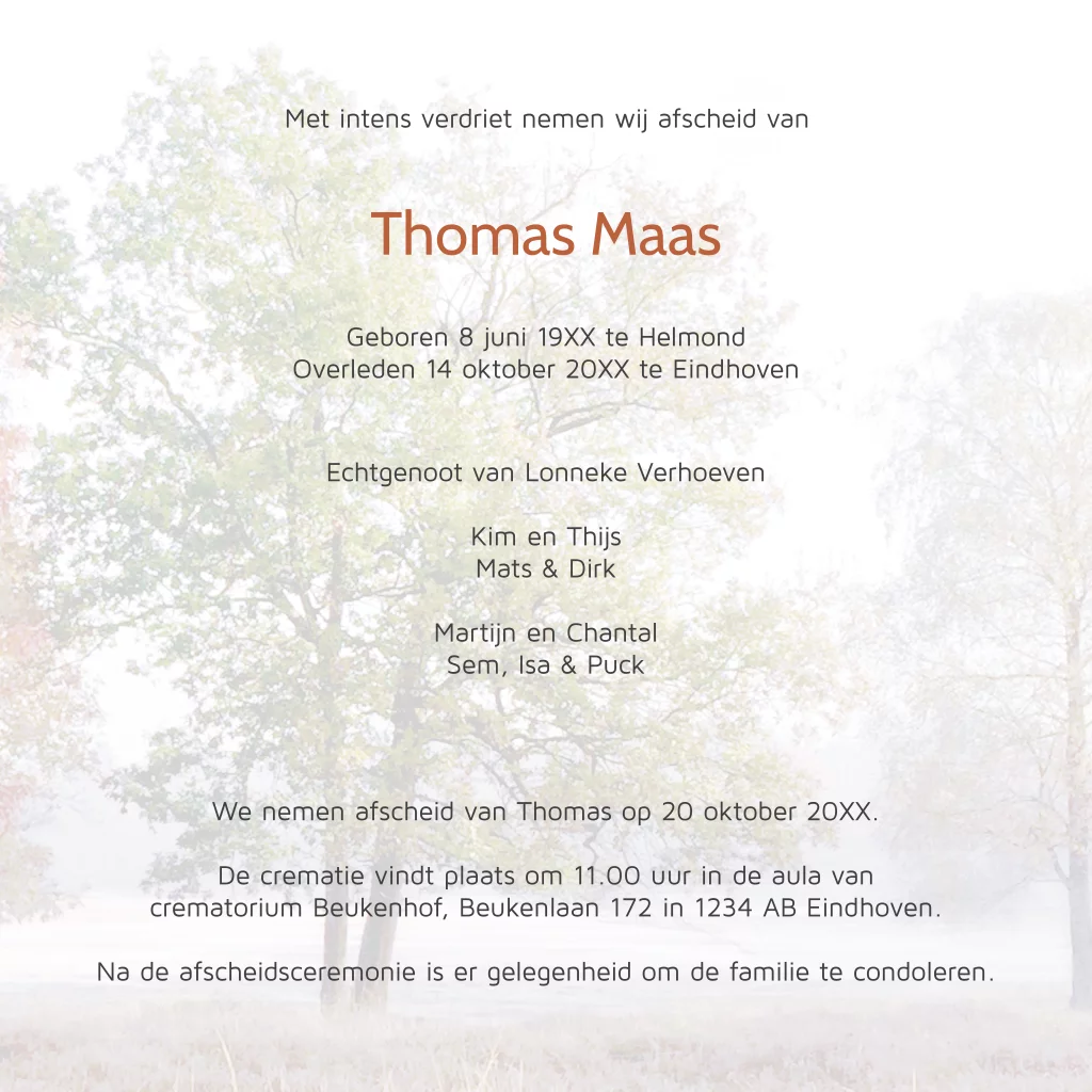 Kies voor deze rouwkaart waarbij voor dit design is gekozen voor het thema natuur. De bomen hebben een prachtig bladerdek in herfsttinten.