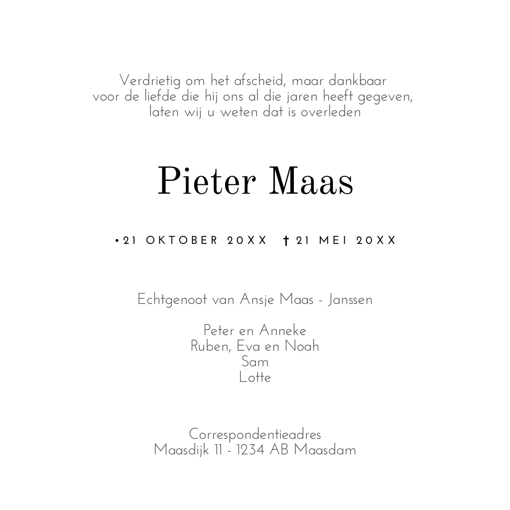 Moderne rouwkaart om familie en vrienden uit te nodigen voor het afscheid van een geliefd persoon.
