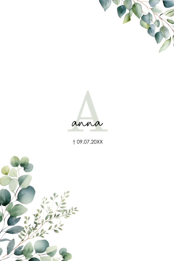 Een prachtige botanische rouwkaart waarbij gewerkt is met verschillende groene tinten. Persoonlijk met initiaal en de naam van uw dierbare.