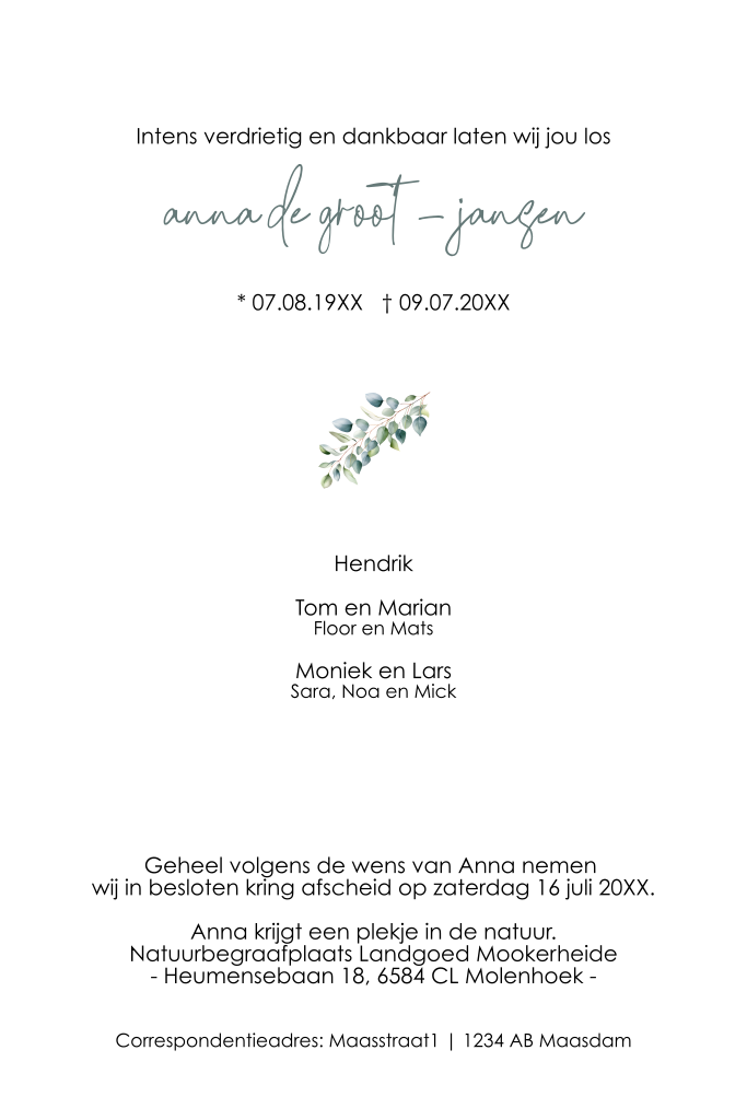 Stijlvolle rouwkaart met eucalyptus en groene takjes