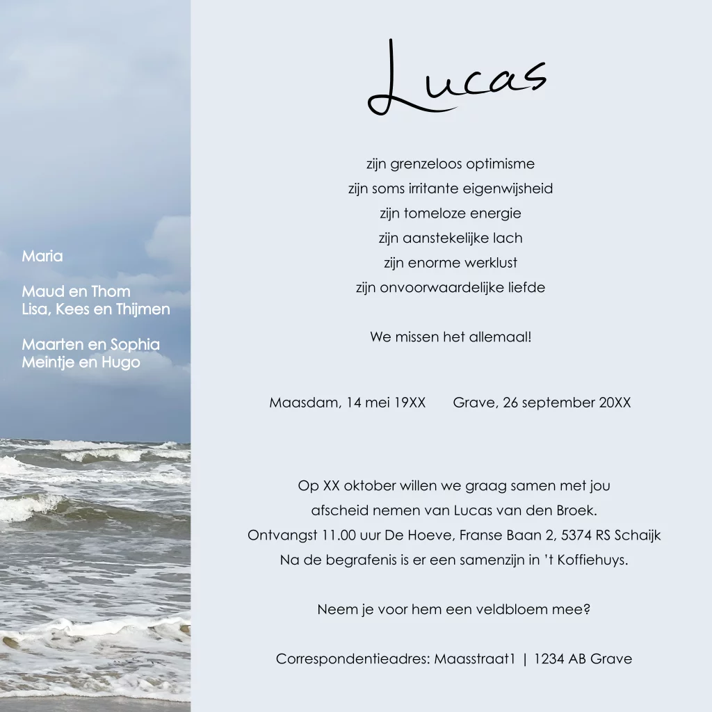 Rouwkaart met persoonlijke foto en foto van de zee