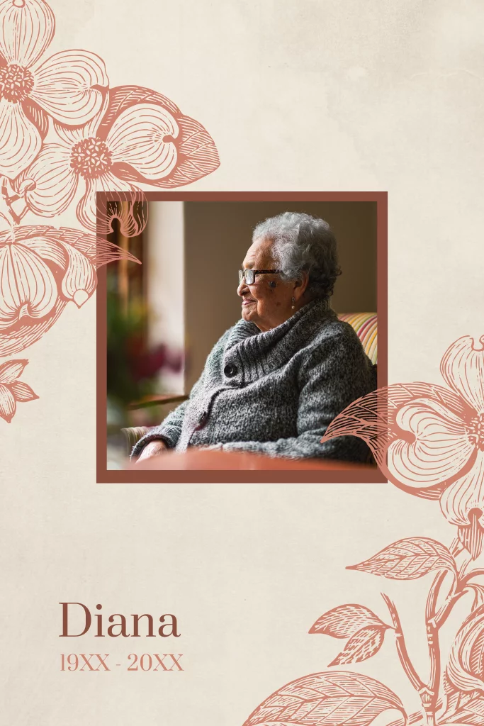 Elegante rouwkaart met persoonlijke foto en sierlijke bloemen in terracotta tinten. Een stijlvolle manier om een dierbare te herinneren.