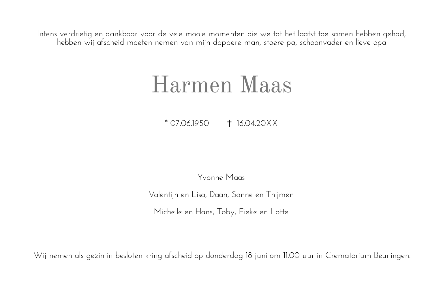 Een persoonlijke rouwkaart met een foto van de overledene.