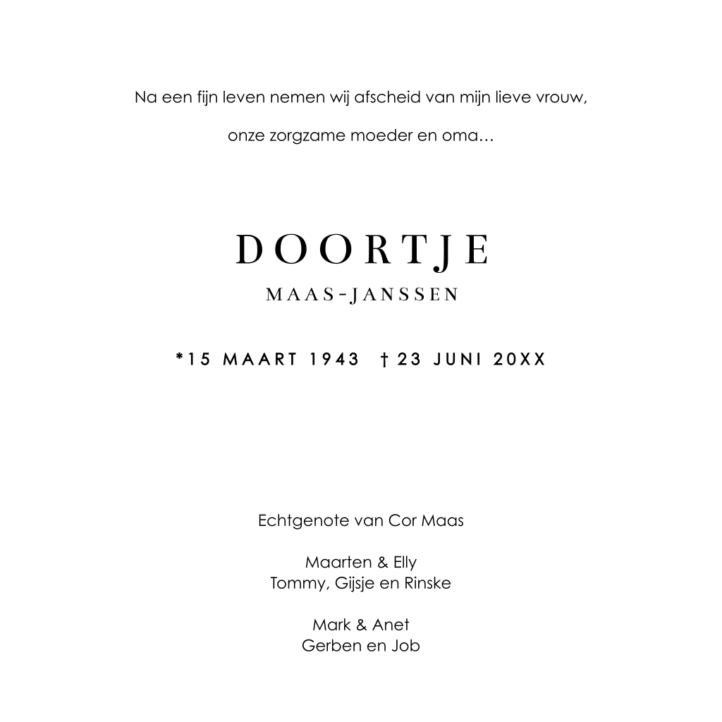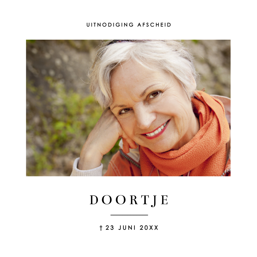 Plaats de foto van jullie overledene gemakkelijk zelf in deze traditionele rouwkaart. En maak de kaart compleet met persoonlijke teksten.
