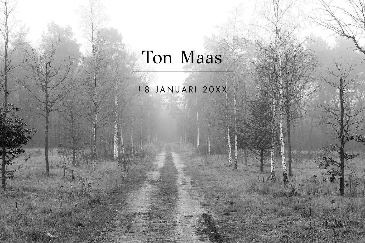 Rouwkaart met zwart-wit foto bospad natuurbegraafplaats