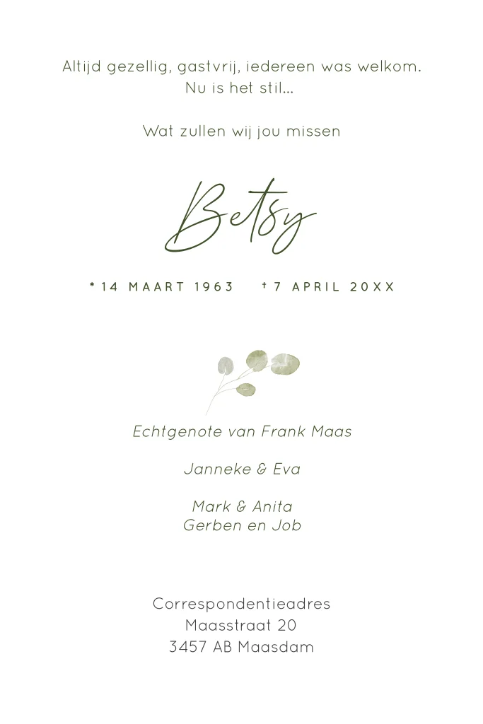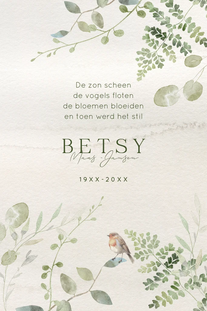 Maak samen in onze editor een persoonlijke kaart voor het afscheid van je dierbare. Kies voor deze prachtige rouwkaart in zachte kleuren groen.