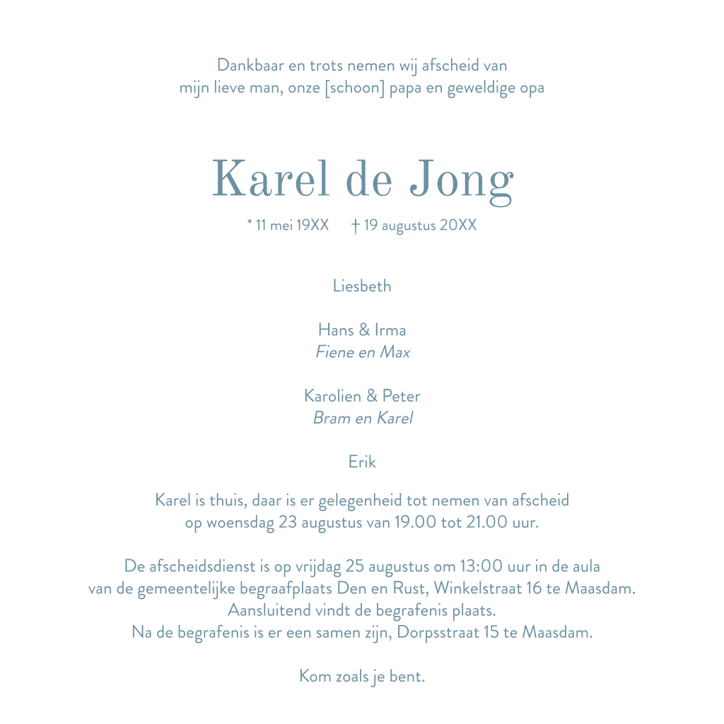 Maak online een moderne kaart om vrienden en familie uit te nodigen voor het afscheid van een dierbaar persoon.