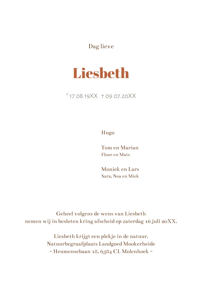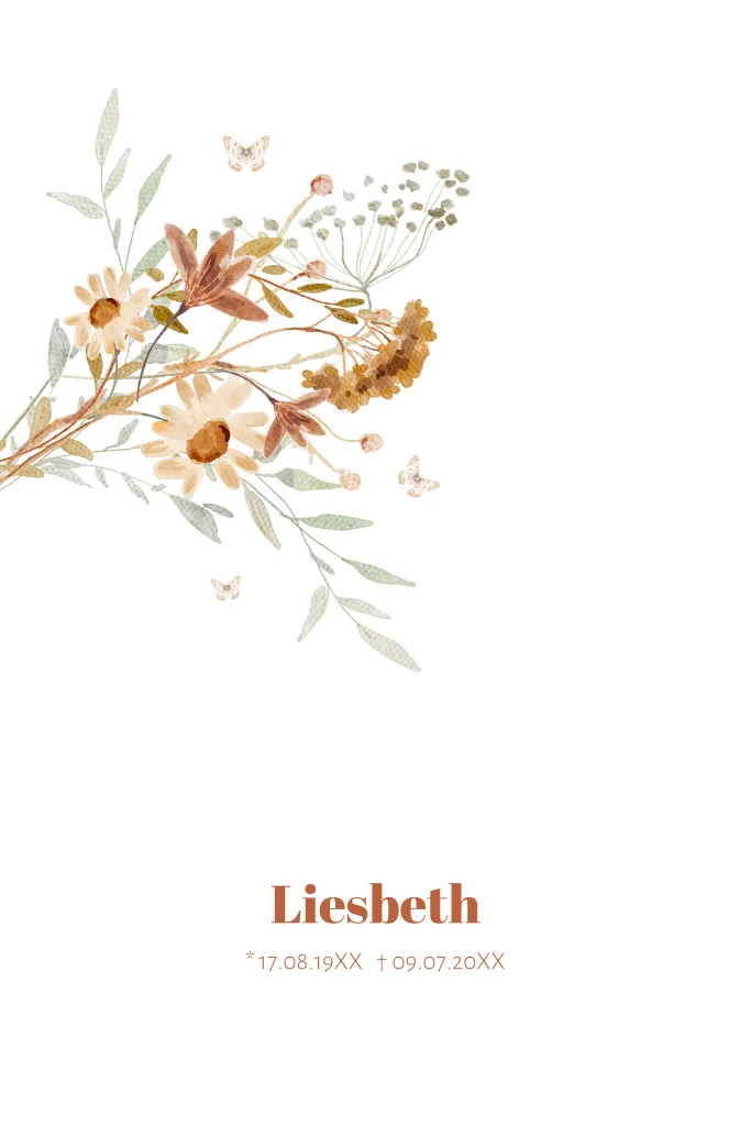 Een stijlvol ontwerp om vrienden te informeren over het overlijden van een dierbare. Met zorg vormgegeven, zodat je op een persoonlijke manier het afscheid kunt aankondigen.
