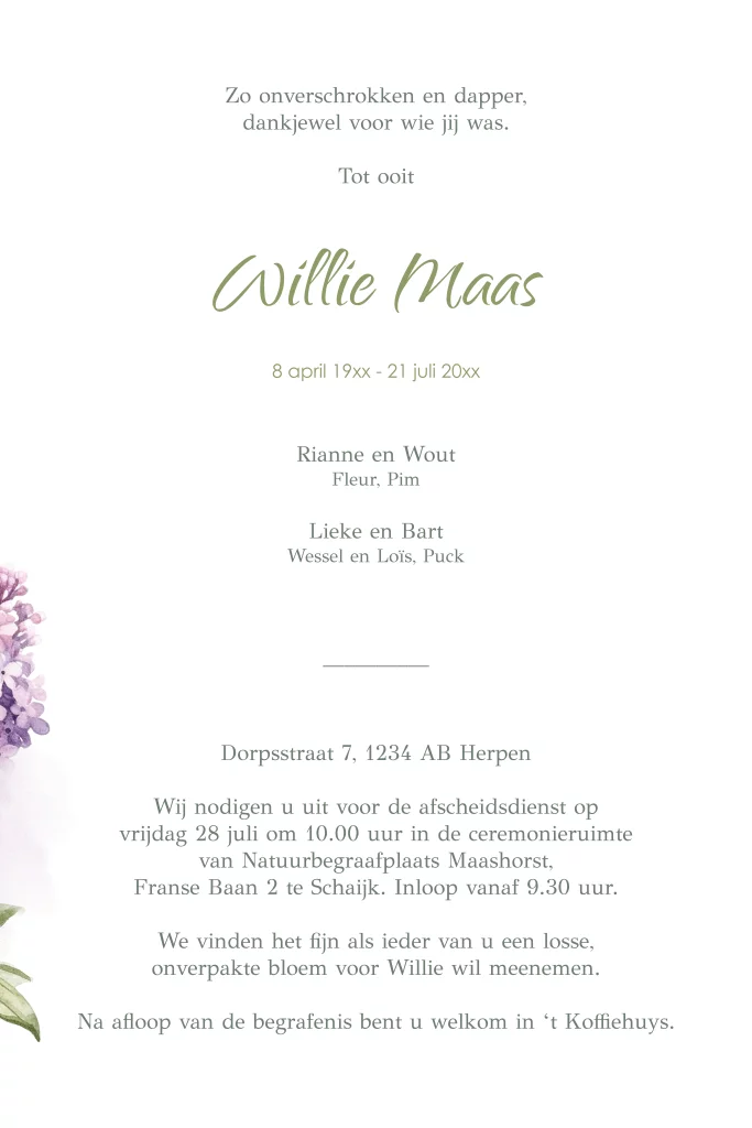 Een stijlvolle rouwkaart zonder foto, met paarse seringen in aquarelstijl – een rustig en liefdevol eerbetoon vol natuur en zachtheid.