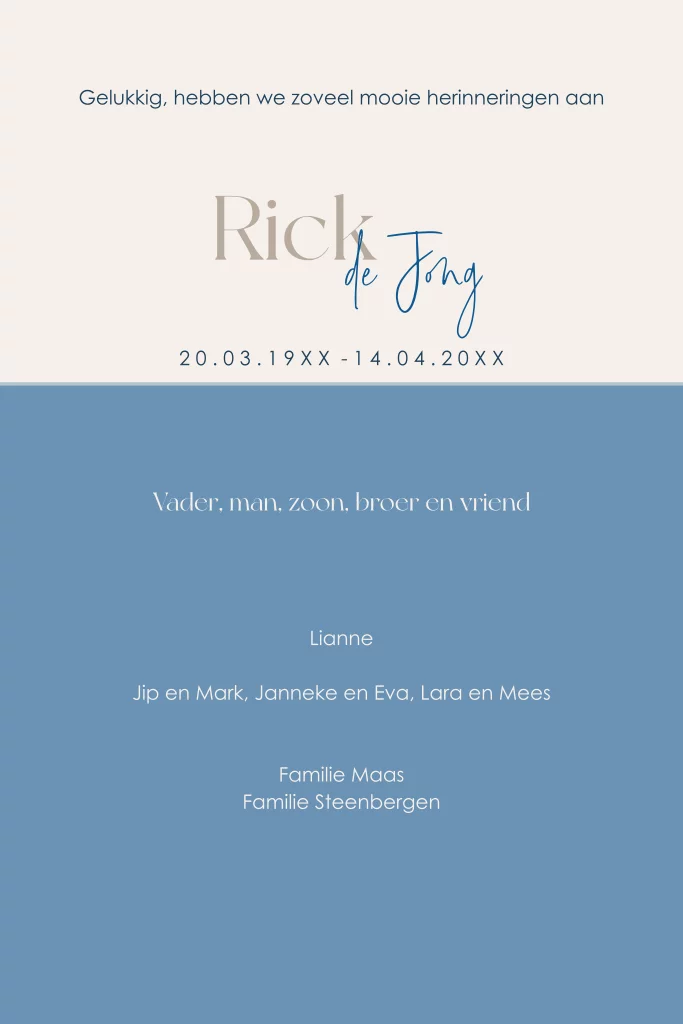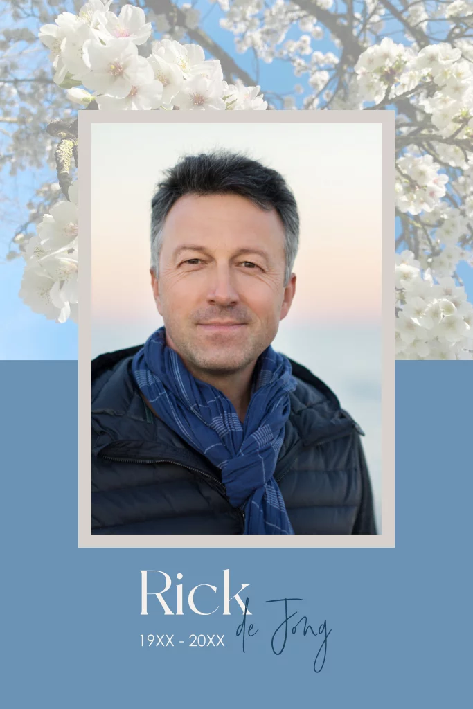 Een stijlvolle rouwkaart met portret en bloesemtakken als symbool van herinnering, verbonden met de lente en het leven.