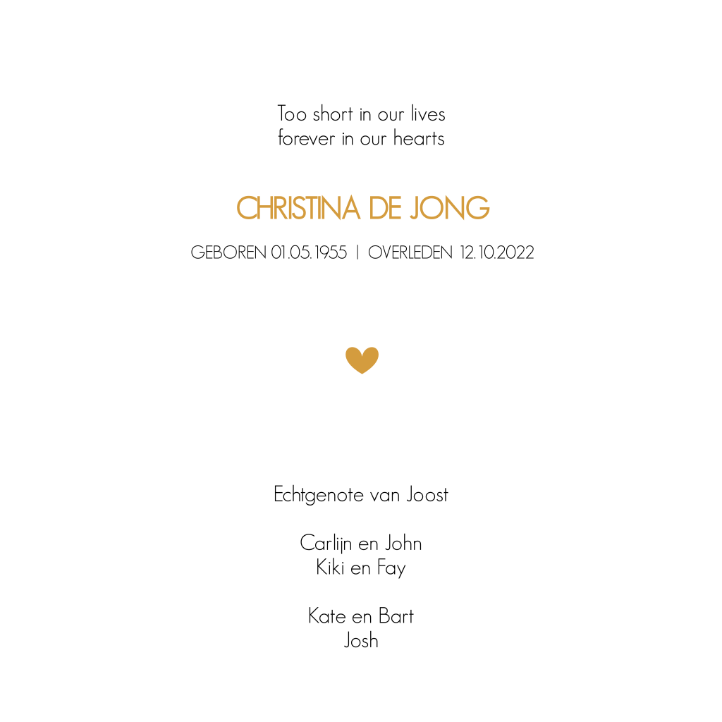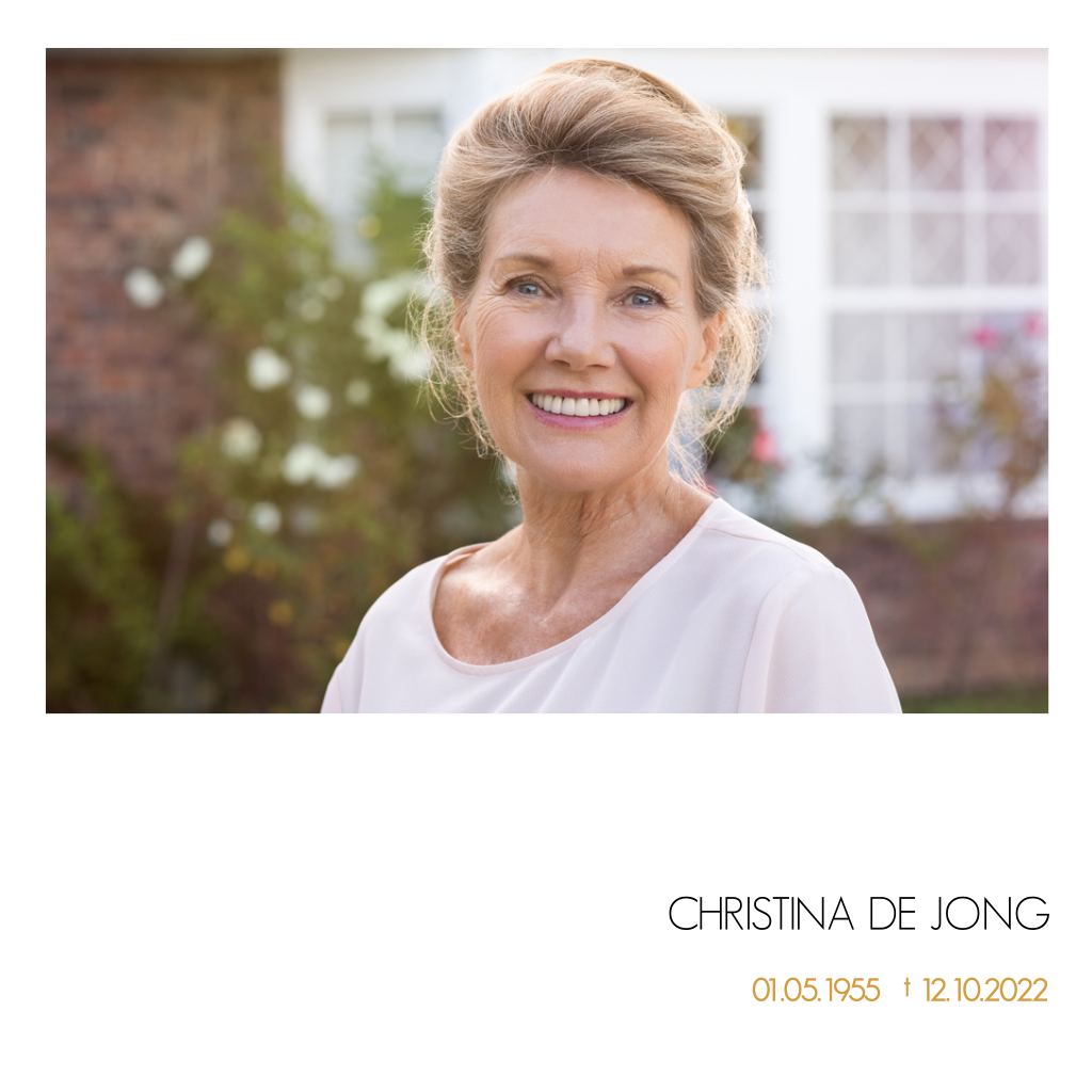 Plaats de foto van jullie overledene gemakkelijk zelf in deze stijlvolle rouwkaart. Wat het vaak extra bijzonder maakt, is om kleuren uit de foto terug te laten komen in bijvoorbeeld tekstkleur of andere vormen op de kaart. Daardoor wordt het een geheel.