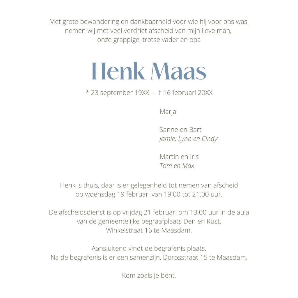 Deze zachte rouwkaart met duif en luchtige tekst brengt een liefdevol eerbetoon en gevoel van verstilde verbondenheid.