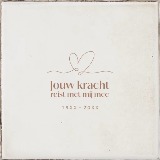 Keramiek herinneringstegel met hartlijn en tekst ‘Jouw kracht reist met mij mee’. Een waardevol troostcadeau voor zoon of dochter.