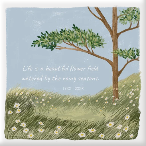 Keramiek herinneringstegeltje met bloemenveld en mooie woorden. Een decoratie die een unieke charme brengt in jouw huis.